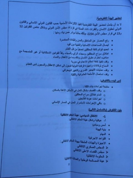 في الصفحة الثانية: يأتي بند «تحضير البيئة التفاوضية» ويتضمن رفع الحصار وإيصال المساعدات وتحديد قوائم المعتقلين إطلاق سراح المعتقلين السياسيين وقف تنفيذ كافة أحكام الإعدام السماح برقابة السجون ومراكز الاعتقال وقف عمليات التهجير وقف استعمال الأسلحة العشوائية.