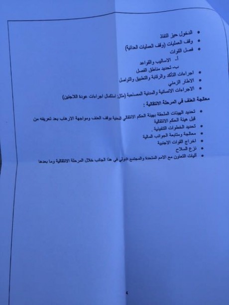ثم يلي بند «لدي البدء بالتفاوض» وفيه وقف القصف اتمام إطلاق السجناء احراءات عودة اللاجئين وثم باقي اجراءات العمل الإنساني.