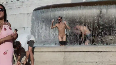 وصُور الرجلان وهما يرقصان في نافورة “بيازا فينيسيا” في العاصمة روما. وقد أنزل أحدهما سرواله الداخلي.