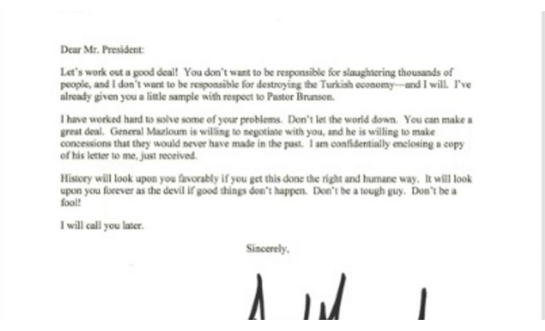 وختم ترامب رسالته الى اردوغان بالقول “لا تكن رجلا متصلبا. لا تكن أحمقا”، مضيفا “سوف أتصل بك لاحقا”.