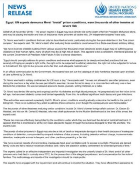 ويعتبر ذلك أول إعلان دولي عن دور للحكومة المصرية في وفاة الرئيس السابق محمد مرسي، وقد صدر عن مقررة القتل خارج إطار القانون وفريق الاعتقال التعسفي بالأمم المتحدة.