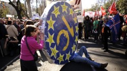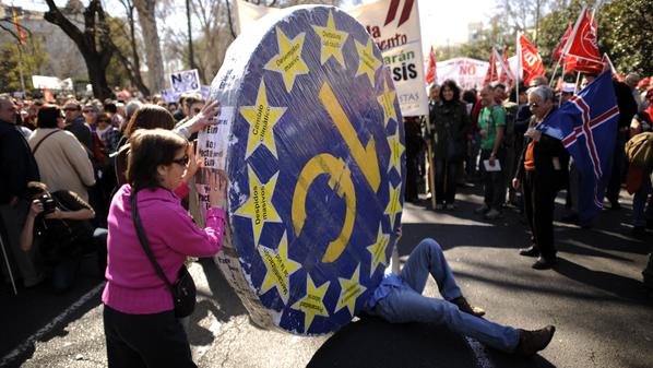 Protesters hold a a fake euro coin during an anti-austerity demonstration in Madrid on March 11, 2012. This is a test of support for a general strike called for March 29. AFP PHOTO / PEDRO ARMESTRE (Photo credit should read PEDRO ARMESTRE/AFP/Getty Images)