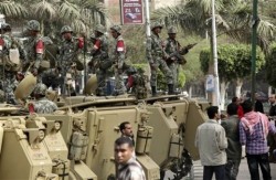 Egyptian army soldiers stand atop their armoured personnel carriers as anti-government protesters gather in Cairo, Egypt, Saturday, Jan. 29, 2011.(AP Photo/Victoria Hazou)