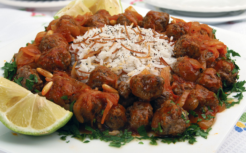 يُزين بالصنوبر المحمص ويُقدم مع الأرز بالشعيرية