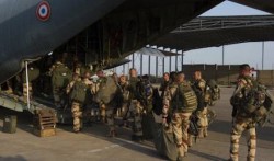 فيما كان وزير الخارجية لوران فابيوس يبدأ مؤتمراً صحافياً مخصصاً لـ«الحرب على الإرهاب في مالي»، كان رتل من حوالى ثلاثين آلية عسكرية فرنسية ترافقه طوافة، يعبر المركز الحدودي بين شاطئ العاج ومالي في بوغو (شمال البلاد) ويشق طريقه نحو غرب البلاد. ذلك أن متمردين إسلاميين شنوا هجوماً مضاداً بوسط غرب مالي رغم غارات جوية فرنسية على مدى أربعة أيام استهدفت مواقعهم بشمال البلاد. وكانت الطائرات انطلقت من بوركينا فاسو والتشاد يوم الأحد من فرنسا مباشرة. ونتيجة لضغوط باريس قالت عدة دول في المنطقة انها سترسل جنود على الارض هذا الاسبوع، كما يجتمع قادة عسكريون من الدول الاعضاء في «ايكواس» (منظمة غرب أفريقيا) في باماكو يوم الثلاثاء حيث من المتوقع أن تقود نيجيريا القوة الأفريقية.