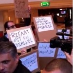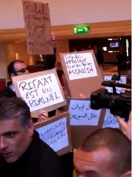 بالطبع ‬لم يكن هذا رأي الذين حضروا وهدفهم الظاهر «منع المؤتمر وفضح رفعت». نحن ‫السوريين «معارضين لبشار الأسد ولعمه‬»، هكذا صرخ سوري لم يتردد من البوح باسمه، «أكتب اسمي هيثم المصري». لم يكن عدد المعترضين على المؤتمر كبيرآً إلا أن صوتهم كان يسرد تاريخ رفعت «من حماة حيث ٤٢ ألف قتيل ضربهم من البحر والجو والبر». بعد أخذ ورد استطاعت الشرطة أن تخرح المتظاهرين ولكن أجواء المؤتمر كانت متلبدة.
