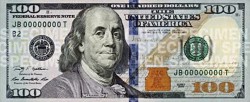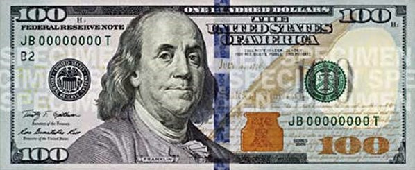 وستبقى صورة بنجامين فرنكلين احد مؤسسي الولايات المتحدة على الورقة النقدية المقبلة جريا مع القواعد العامة للعملة الاميركية المتداولة المعتمدة في 1928. وستتضمن الورقة النقدية شريطا امنيا ازرق يحتوي على صور ثلاثية الابعاد (اجراس ورقم مئة).