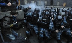 وهاجمت الشرطة المحتجين الذين ظلوا معتصمين في الميدان بعد اكبر مظاهرات ليل الجمعة ضد قرار الرئيس فيكتور يانكوفيتش بعدم التوقيع على اتفاقية تاريخية بشأن التجارة مع الاتحاد الاوروبي.
