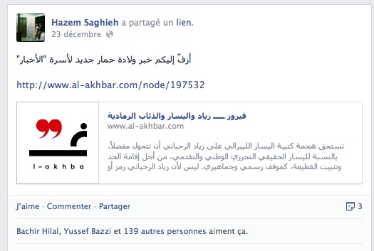 في يوم عيد الميلاد كتب حازم صاغية تعليقاً يقفز عنوانه إلى خانة عدم اللياقة متجاوزاً خانة الاستفزاز. كتب حازم صاغية في إشارة إلى مقالة صدرت في صحيفة «الأخبار» اللبنانية ما يلي «أزفّ إليكم خبر ولادة حمار جديد لأسرة “الأخبار”».