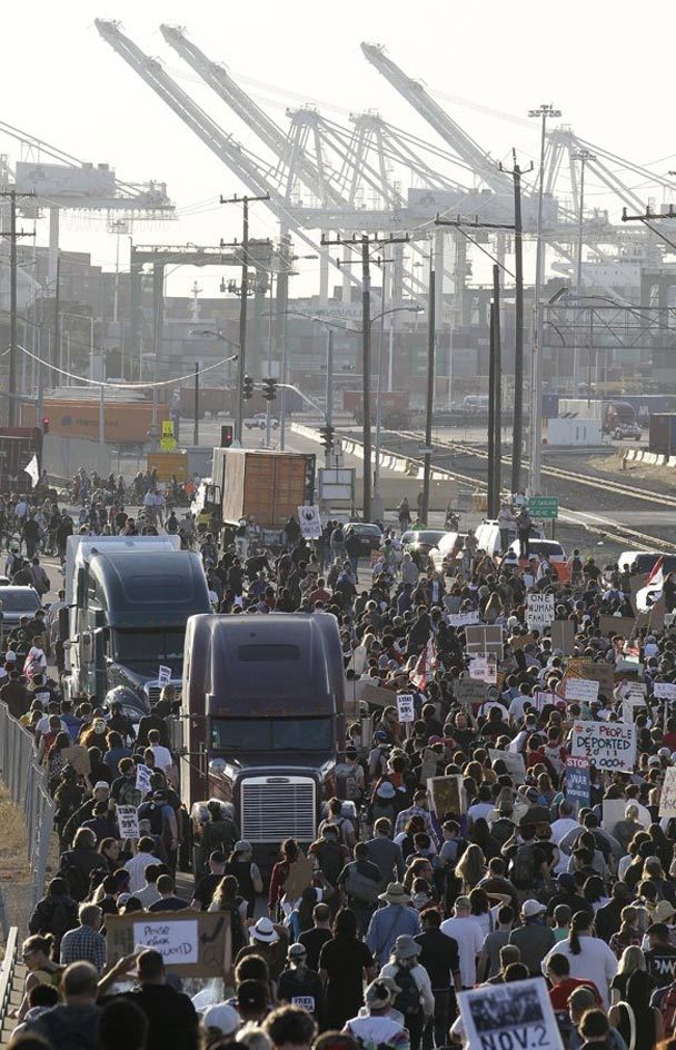 نجح نشطاء حركة احتلوا «وول ستريت»، الذين يحاولون اغلاق موانئ الساحل الغربي للولايات المتحدة، في اغلاق العديد من المرافئ، واشتبكوا احياناً مع الشرطة، لكنهم لم يصلوا إلى حد الحصار الكامل الذي تعهدوا به.