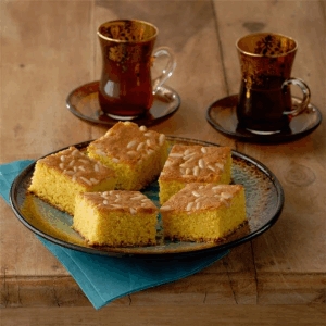 يُدهن قالب مخصص للفرن بالطحينة ويُسكب المزيج بداخله ويُزين وجهه بالصنوبر