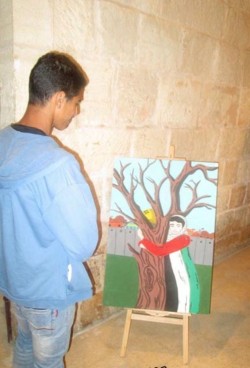 فعلاء صافي -وهو من مخيم الجلزون وكان يقف مع أبيه بجوار لوحته- استطاع بكلمات بسيطة شرح فكرته قائلا إن هذه “السيارة هي دورية الجيش اللي بتجي قدام المخيم وهاي الدبابة شفتها بالشارع وهاي الطيارة اللي كانت تقصف.”