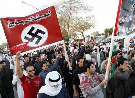 Stateless residents in Kuwait holding a banner comparing the country’s Committee for the Stateless to that of Hitler’s regime march in As-Salbiya February 19, 2011. Kuwait state security forces were out in force to prevent the demonstration from becoming violent. Kuwaiti police fired teargas at hundreds of stateless Arabs demanding citizenship in a second day of protests in the village outside the OPEC member’s capital on Saturday, a human rights activist said. The banner reads: “Committee for the Stateless”. REUTERS/Stephanie McGehee (KUWAIT – Tags: POLITICS CIVIL UNREST)